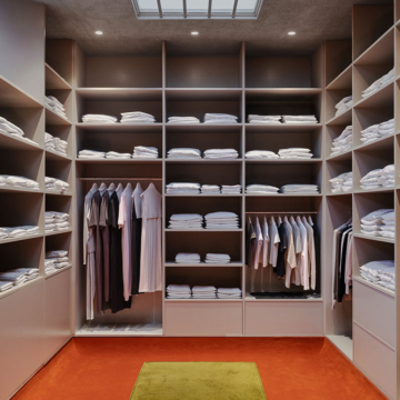 建築家ヒッデ・ダイクストラ氏と共に手がけたこの空間は、従来のブティックとは一線を画すユニークな構成です。ハンガーを一切使用せず、スタッフが一人ひとりに丁寧に接客を行うスタイルを採用しています。