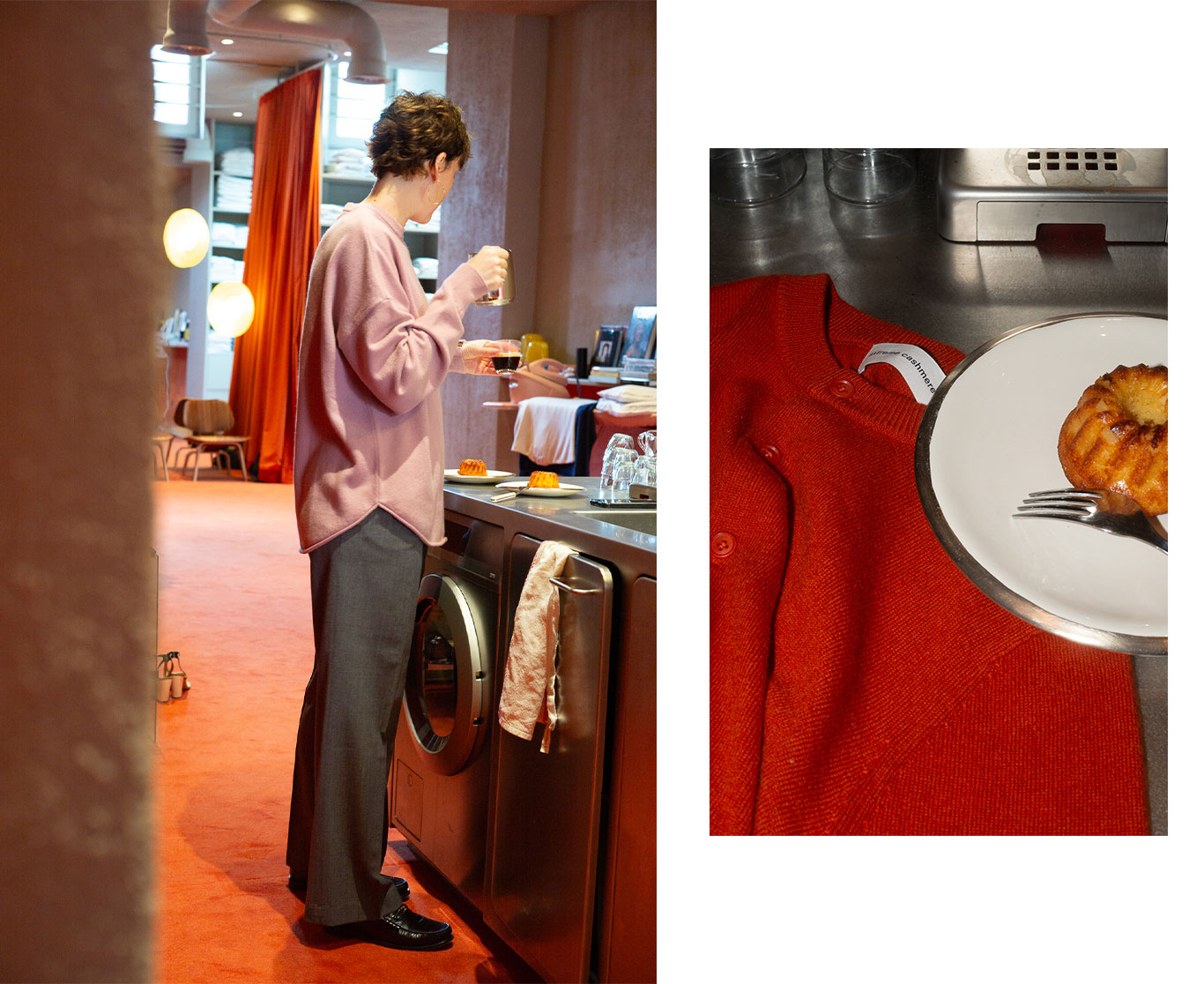 中央にはステンレス製のキッチンブロックとミーレの洗濯機を備え、ブランドの象徴である「食」と「カシミア・スパ」の文化を空間全体で表現しています。運河沿いの静かなエリアに佇む店舗は、まるで日常の延長にある友人宅のリビングルームのような佇まいです。