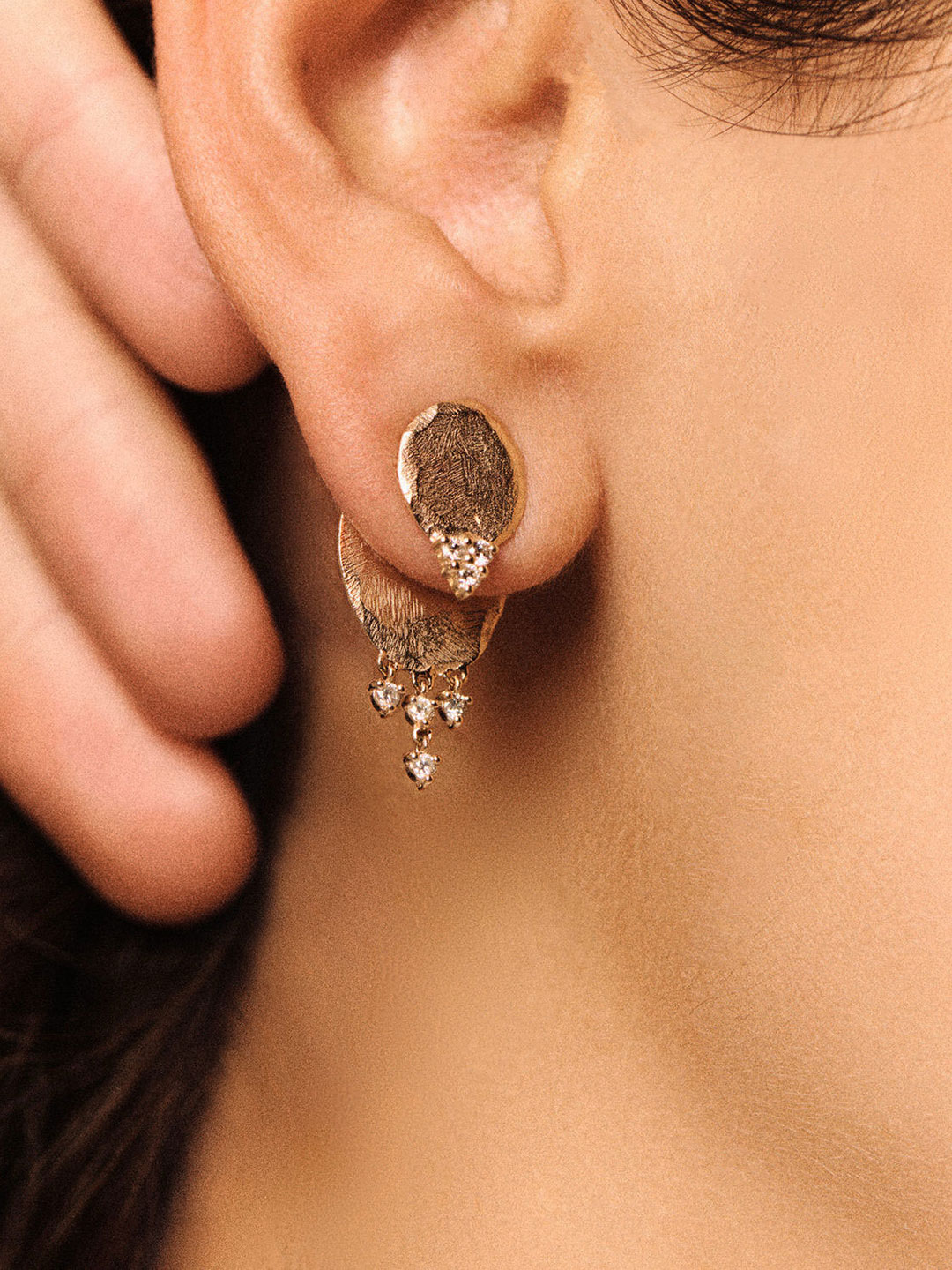 石の内包物や色の揺らぎを魅力として捉え、ゴールドやシルバー、ベークライトなど異素材を繊細に組み合わせたデザインは、フレンチ・シックとボヘミアンの空気を軽やかに融合。デザインはパリ、制作はインド・ジャイプールで行われ、職人の手仕事による温もりを大切にしています。